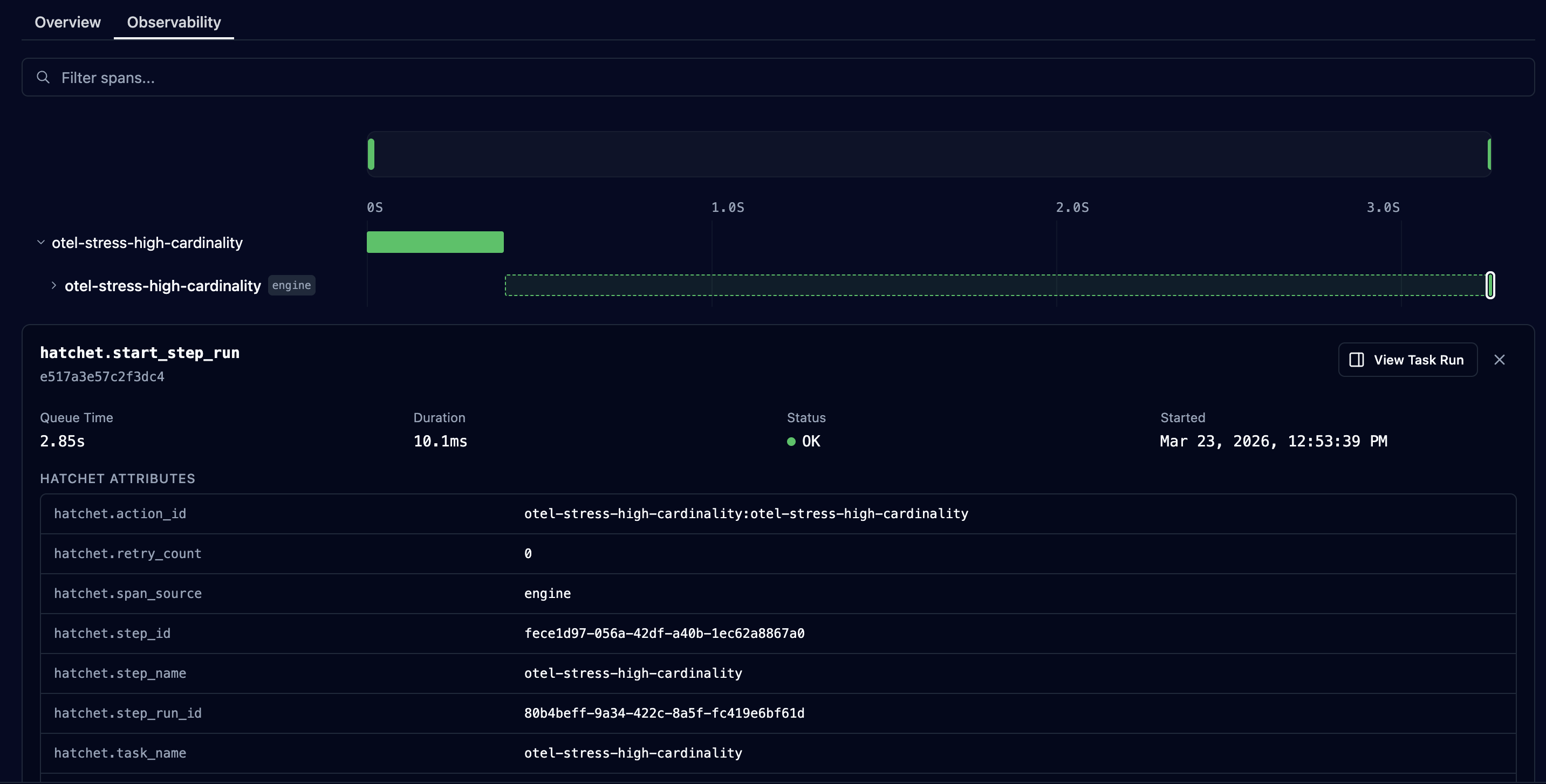 When you use Hatchet Cloud, or you use the self-hosted version and set SERVER_OBSERVABILITY_ENABLED=true, the Hatchet engine will emit spans that provide engine-side information about your tasks, such as when they were queued, started, and failed. The default spans provide useful context: