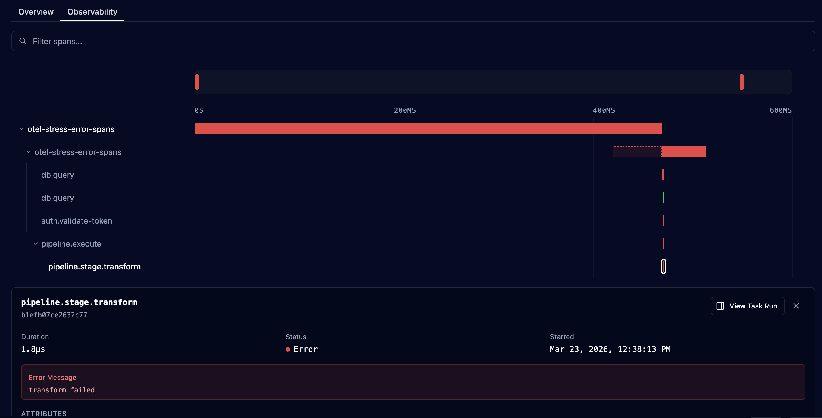When a task fails, the engine will automatically emit an error span with the stack trace and error message. This means that you can see exactly where and why a task failed. You can also choose to set your own otel status codes for additional context: